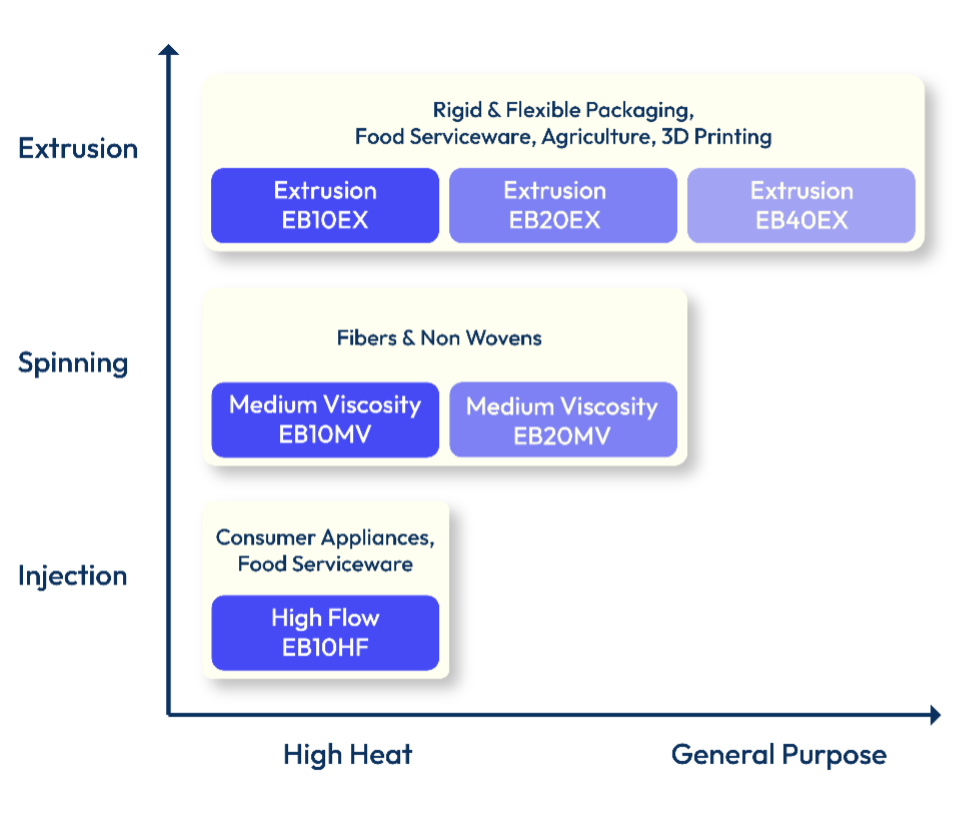 The Embio portfolio includes a range of PLA grades suitable for rigid and flexible packaging, coated paperboard, fibers, nonwovens, and 3D printing.